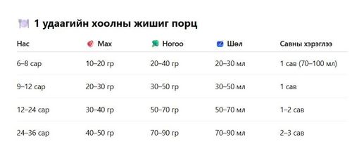 📍 Тайлбар: Сав бүрийг “мах+ногоо+шөл” хамтад нь эсвэл тусад нь хувааж хөлдөөж болно. Наснаас хамааран нэг удаагийн порцын хэмжээ өөрчлөгдөнө.